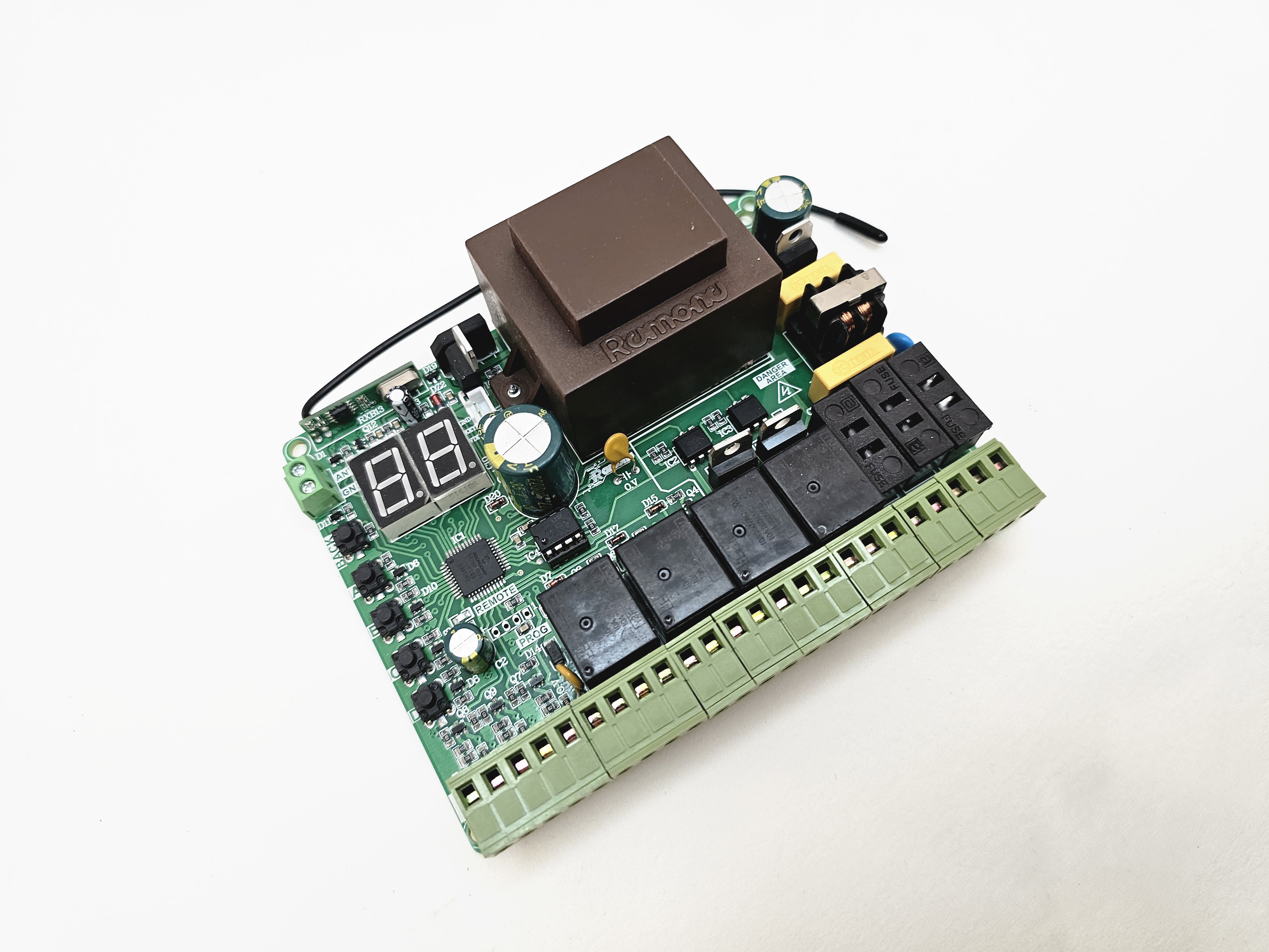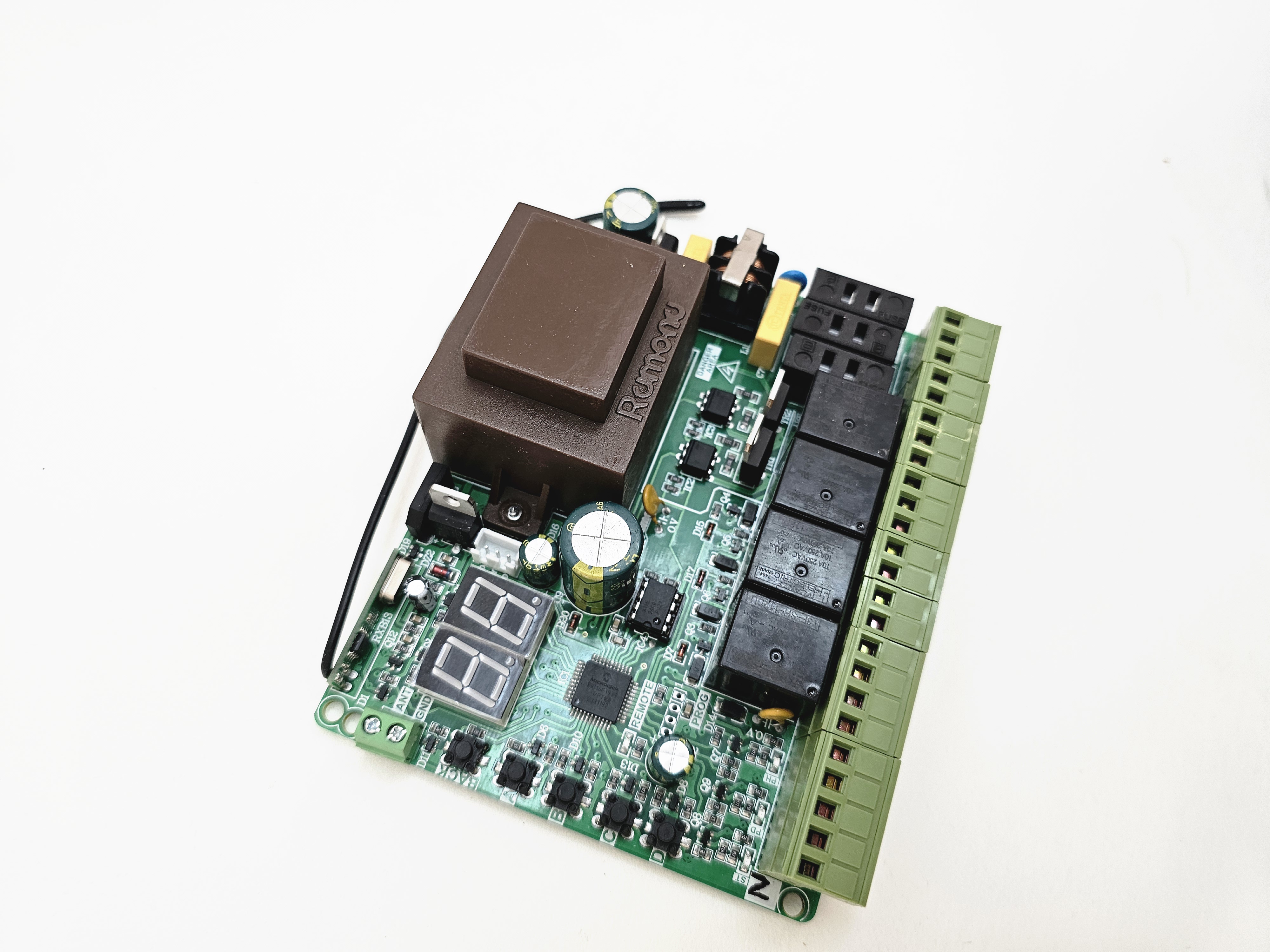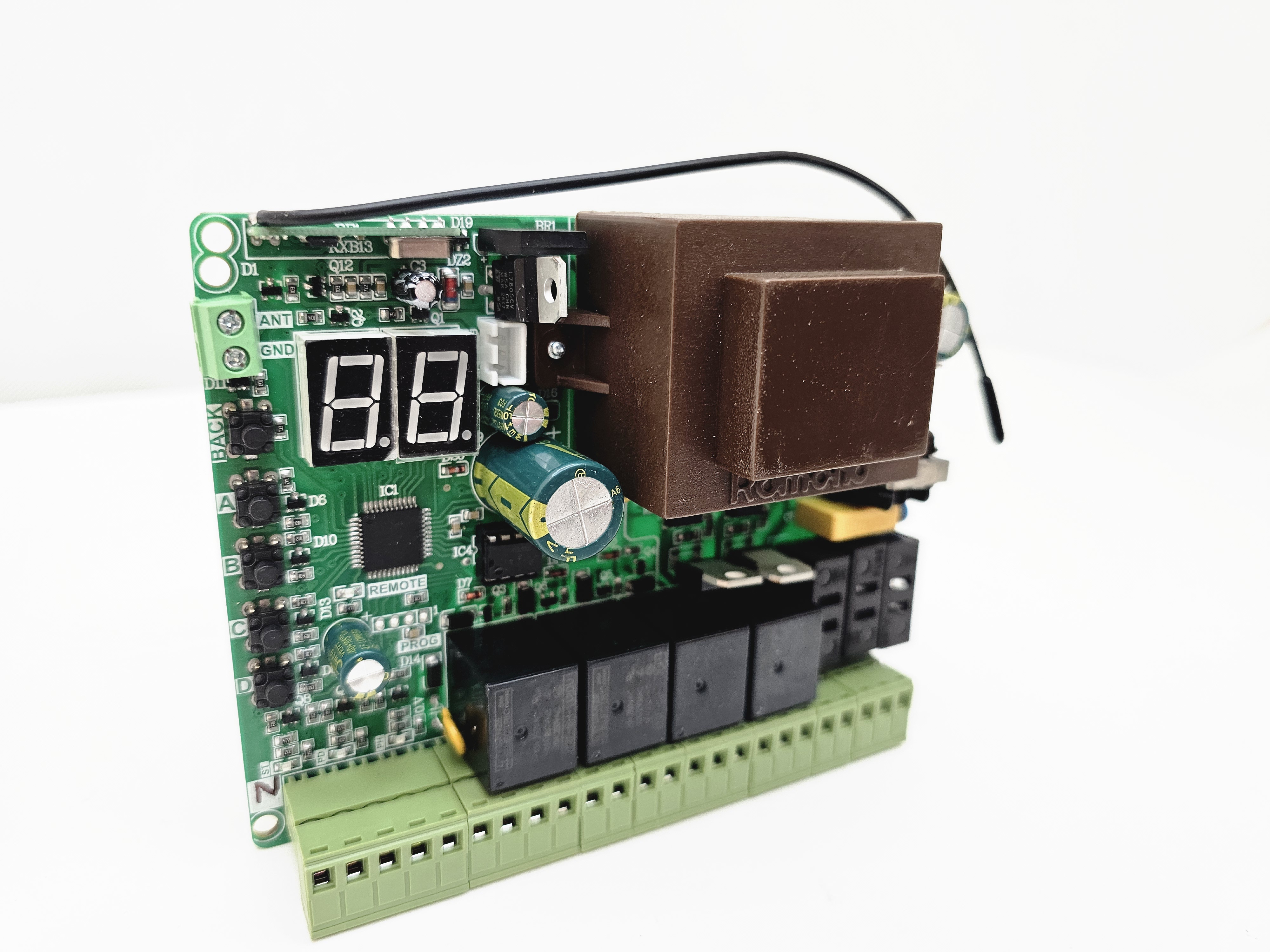 قابلیت ها: نمایشگر2رقمی و تنظیمات با دقت یک ثانیه. قابلیت بستن فرمانهای خارجی جهت جلوگیری ازنصب رسیور خارجی. قابلیت نمایش شماره ریموت و حذف ریموت خاص. حفاظت ولتاژ خروجی20ولت در برابر اتصال کوتاه برنامه ریزی مجزا برای درب دولنگه وتک لنگه. زمان بازشدن و بسته شدن بصورت مجزا از هم همراه استارت آرام(SoftStart). قابلیت لرن کردن36عددریموت کدلرنینگ وهاپینگ کدهمزمان. قابلیت تنظیم سه سرعت برای هر لنگه به صورت مجزا. قابلیت حرکت جکها به صورت مجزا از هم توسط ریموت به جای خالص کردن جک. تست چشمی قبل از حرکت.